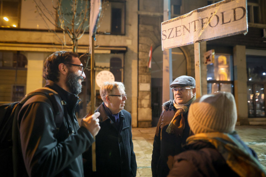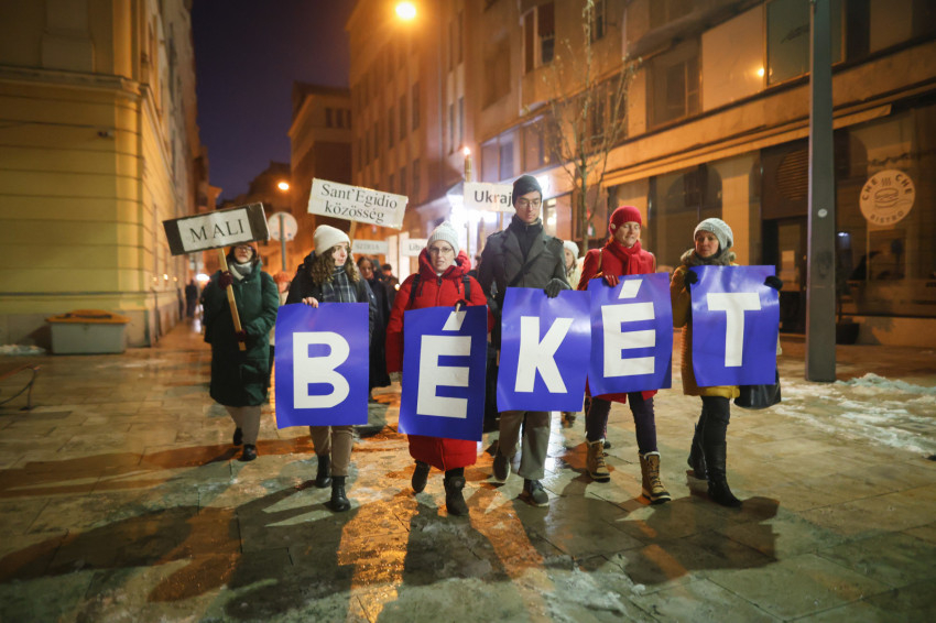 A Corvinus Egyetem előtti téren Szőke Péter, a Sant’Egidio közösség regionális felelőse mondott beszédet. Felidézte Ferenc pápa alakját, aki a háború alternatívájaként az egyetemes testvériség álmát, látomását állította a középpontba, majd Leó pápáról beszélt, aki megválasztása utáni első beszédében a fegyvertelen és lefegyverző béke üzenetével, a feltámadt Krisztus békéjével köszöntötte a világot.