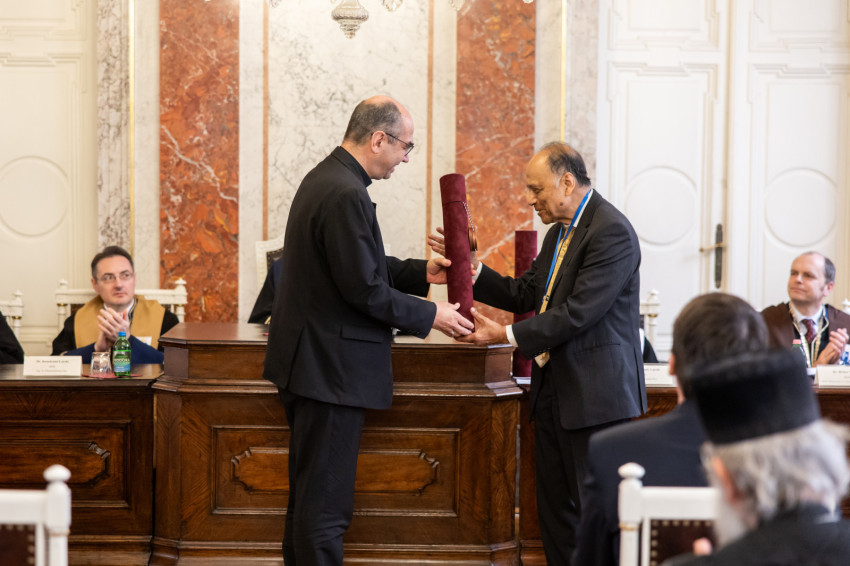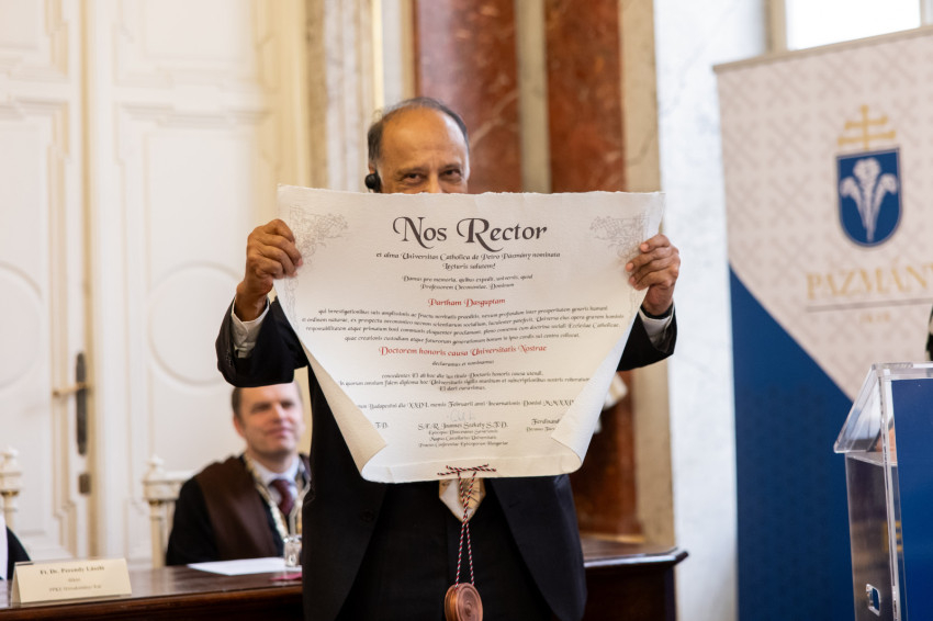 A laudáció után Székely János püspök, a PPKE nagykancellárja átadta Sir Partha Dasgupta közgazdászprofesszornak a díszdoktori oklevelet. A professzor az oklevél átvétele után arról az Áder János által is említett szemléletbeli fordulatról – és e fordulatnak a fenntartható fejlődést szolgáló következményeiről – beszélt, amely az emberi személyt már nem önmagában, minden mástól elszigetelten nézi, hanem mint a természet részét, hiszen az ember már testének alkotóelemei révén is egy nagy rendszerhez tartozik.