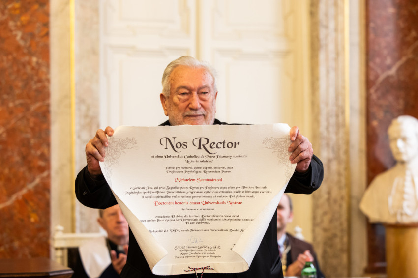 Szentmártoni Mihály SJ pszichológusprofesszort Birher Nándor, a PPKE BTK dékánja méltatta. A dékán laudációja kezdetén hangsúlyozta, hogy „amikor ma a bácskai születésű Szentmártoni Mihály munkásságáról és érdemeiről szólunk, nem csupán egy kiváló pszichológust méltatunk, hanem egy olyan tudóst, papot és lelki kísérőt, aki hidat épített pszichológia és teológia, tudomány és spiritualitás, emberi lélektan és keresztény antropológia között. Egy olyan személyiséget laudálunk, aki