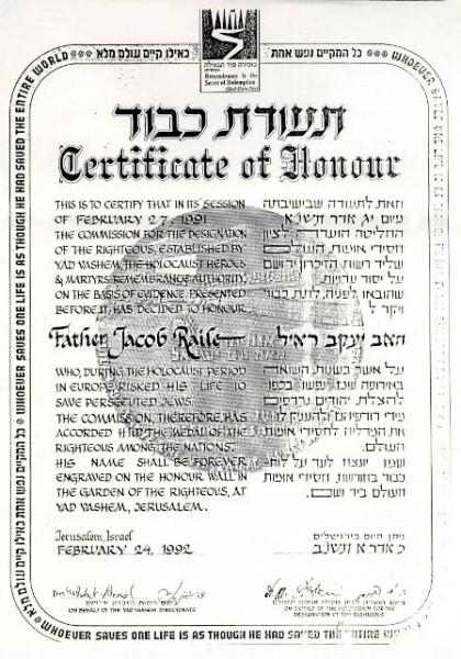 1991. február 27-én a Jad Vasem intézet a Világ Igaza címmel ismerte el Raile Jakab embermentő tevékenységét (rajta kívül még tizenhárom jezsuita kapta meg ezt a címet). A bostoni jezsuiták 2015-ben sírköve mellett elhelyeztek még egy emléktáblát, mely a Világ Igaza címéről emlékezik meg.