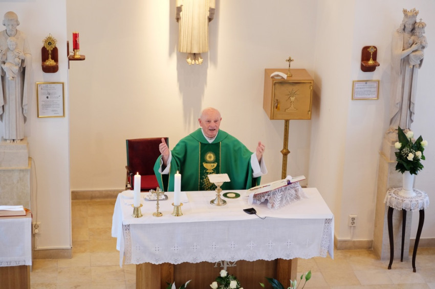 „Szeretetközösség hordoz bennünket – mondja Kozma atya a mise kezdetén, mintegy üdvözlésként. – Ennek a megjelenítője ez a ház is. Fontos, hogy egy ilyen zártabb közösségben is tudjunk tanúságot tenni a hitünkről, és világos legyen számunkra, hogy egymásért élünk. Szűz Mária-szobor avatására készülünk ma: Máriáéra, akire a középkori ember Jézushoz elvezető emberként gondolt. Ő Jézushoz vezessen el bennünket, Jézus pedig egymáshoz!