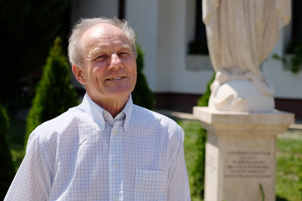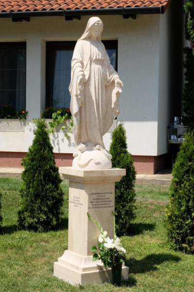 Ebéd után visszasétálunk a szoborhoz Sax László kőfaragó mesterrel, a kivitelezővel. Múlt évben egy közelben álló kőkeresztet restaurált, akkor kapta a megbízást, hogy az intézmény fennállásának huszonötödik évfordulójára készülve készítsen Szűz Mária-szobrot. Sokféle mintát tanulmányozott, míg ezt kiválasztotta. Régóta foglalkozik művészek alkotásainak kivitelezésével, épületek díszítőelemeinek elkészítésével, restaurálással.