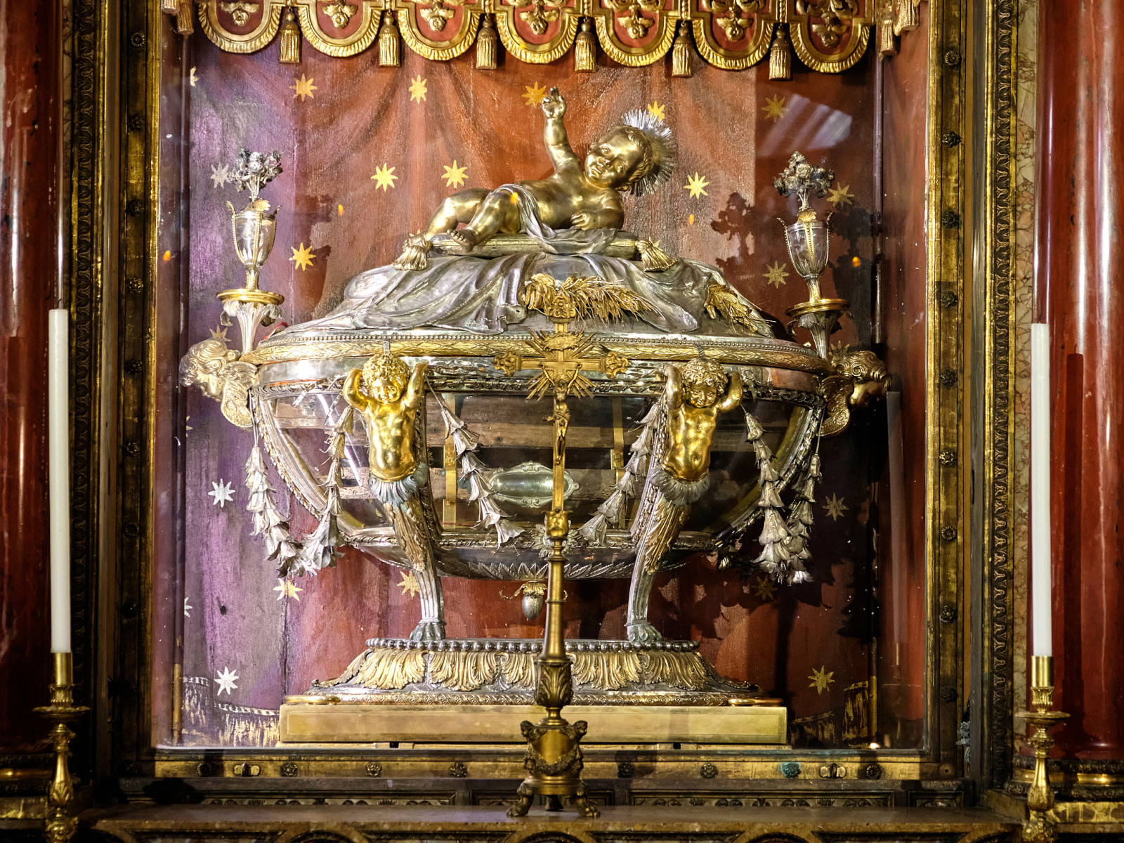 A bazilika márvány baldachinnal fedett főoltára, azaz a pápai oltár előtt egy félkör alakú mélyedésben kápolna található, melynek mai formája Virginio Vespignani építész és Francesco Podesti festő alkotása. Itt őrzik a jászolereklyét egy márványtalapzaton álló, színezüst és aranyozott tartóba helyezett kristályurnában, amit angyalfigurák, angyalfejek és virágfüzérek vesznek körül. Az ereklye létezéséről először Órigenész (185–255) beszél. Szent Jeromos a leveleiben említi a betlehemi szentélyt, és arról is szól, hogy a világ minden részéből érkeznek oda zarándokok. A 7. század közepétől Keleten nem említik többé a betlehemi ereklyét, viszont megkezdődik a tisztelete Rómában, a legnagyobb Mária-bazilikában. I. Teodor pápa (642–649) híres volt az ereklyetiszteletéről. Ő az első, akinek uralkodása alatt a Santa Maria Maggiore-bazilika neve mellett már feltűnik az ad praesepe, „a jászolhoz” melléknév. Római Betlehemnek is nevezték ezt a helyet. Karácsony éjszakáján a pápák évszázadokon keresztül itt mondták az éjféli misét.