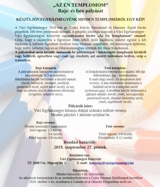 A pályázaton a Váci Egyházmegye hittanos diákjai indulhatnak rajz és fotó kategóriában, korcsoportok szerinti bontásban. A pályaművek beküldési határideje 2019. szeptember 27. péntek.