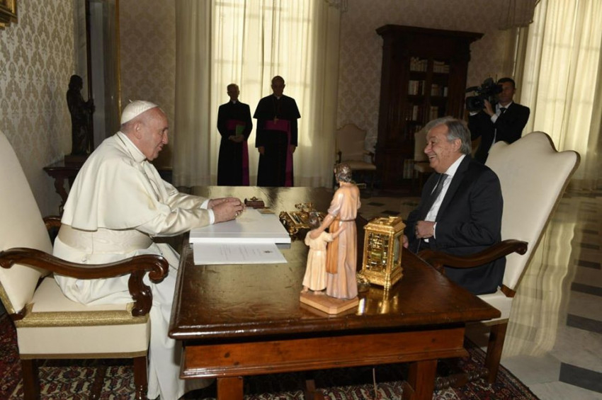 A világszervezet főtitkára köszönetet mondott a pápának a szívélyes fogadtatásért. A remény és az emberiség hírnökének nevezte Ferenc pápát, aki igyekszik csökkenteni az emberi szenvedést és előmozdítani az emberi méltóságot. „Világos erkölcsi hangja felragyog, amikor a legsérülékenyebbek, köztük a menekültek és migránsok helyzetéről szól... amikor szembenéz a szegénységgel és az egyenlőtlenséggel... valamint felhívást intéz a leszerelés érdekében... vagy hidakat épít közösségek között... illetve amikor rámutat a klímaválságra a Laudato si’ kezdetű történelmi enciklikáján keresztül... vagy számos más alapvetően fontos témában való felszólalásakor. Ezek az üzenetek megegyeznek az ENSZ Charta alapértékeivel, vagyis azzal, hogy újra megerősíti a személy méltóságát és értékét, előmozdítja az emberek szeretetét és a Föld védelmét, támogatja az emberiséget és védelmezi közös otthonunkat. Világunknak mindennél jobban szüksége van most erre” – hangsúlyozta Antonio Guterres.