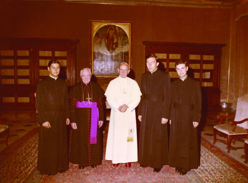 Márton Áron püspök Rómában tanuló kispapjaival Szabó Árpáddal, Vencser Lászlóval és Jakubinyi Györggyel VI. Pál pápa magánkönyvtárában • Fotó: Nagy Zoltán archívuma
