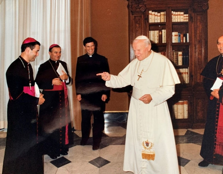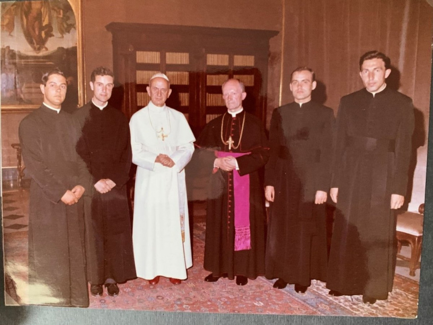 Jakubinyi György segédpüspök, Bálint Lajos érsek, Rencsik István nagyváradi pap, a római Collegium Germanicum et Hungaricum növendéke, II. Szent János Pál pápa, Tempfli József nagyváradi püspök • Fotó: Jakubinyi György érsek archívuma
