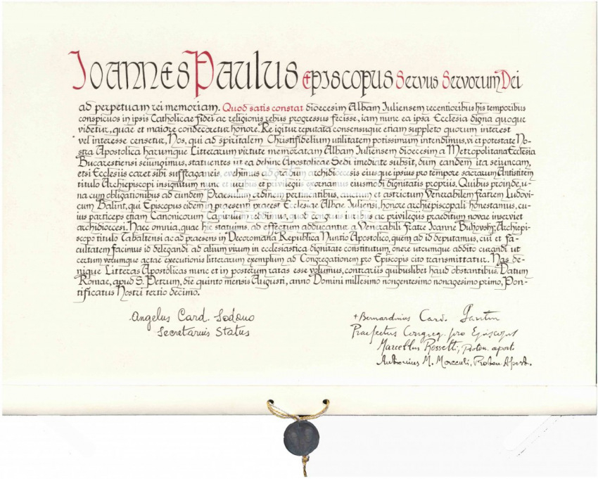 A gyulafehérvári püspökség érseki rangra emeléséről szóló pápai oklevél (1991. augusztus 5.) – Bernád Rita Magdolnától, a Gyulafehérvári Főegyházmegyei levéltár főleváltárosától