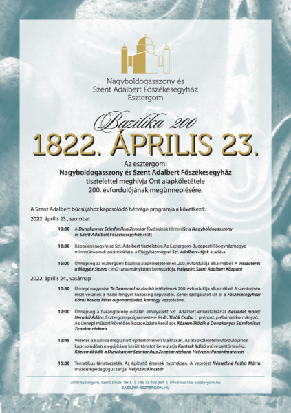– április 23., szombat, 15 óra: konferencia és könyvbemutató az alapkőletétel 200. évfordulójára emlékezve (Szent Adalbert Központ),