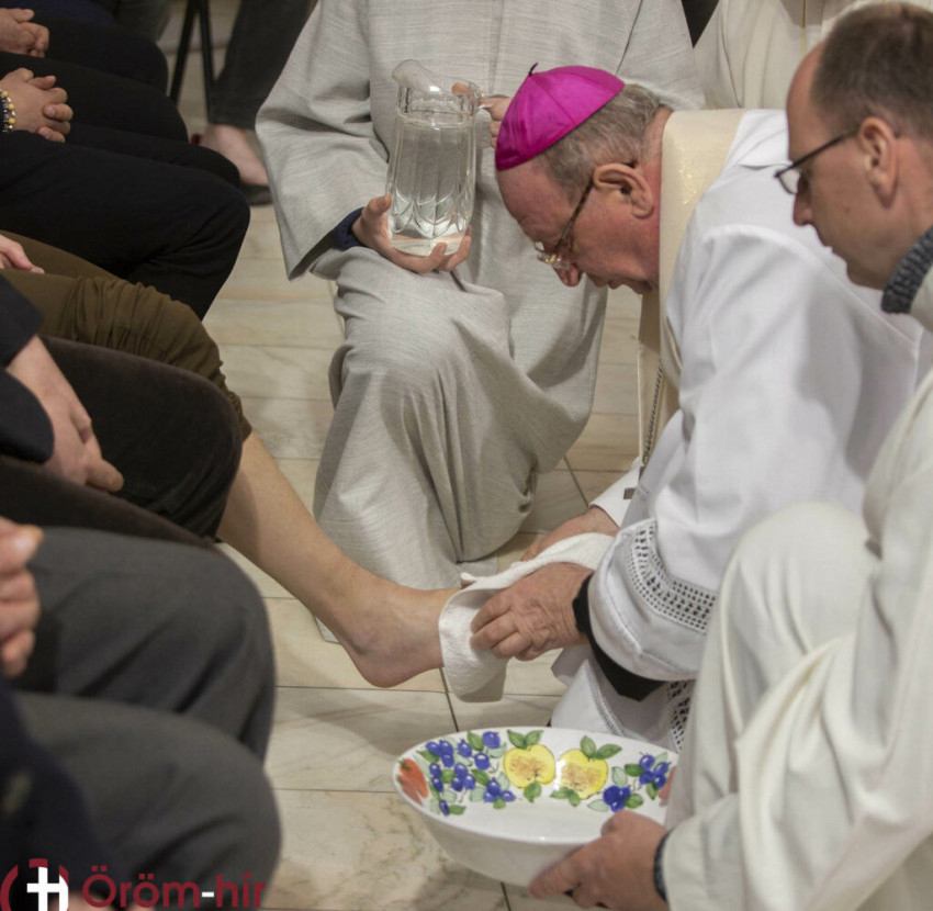 A homília után a lábmosás szertartása következett, amelyben az egyházmegye főpásztora 12 férfi lábát mosta meg. A szertartás végén az asszisztencia csendben vonult ki, majd a közösségek virrasztást tartottak a székesegyházban.