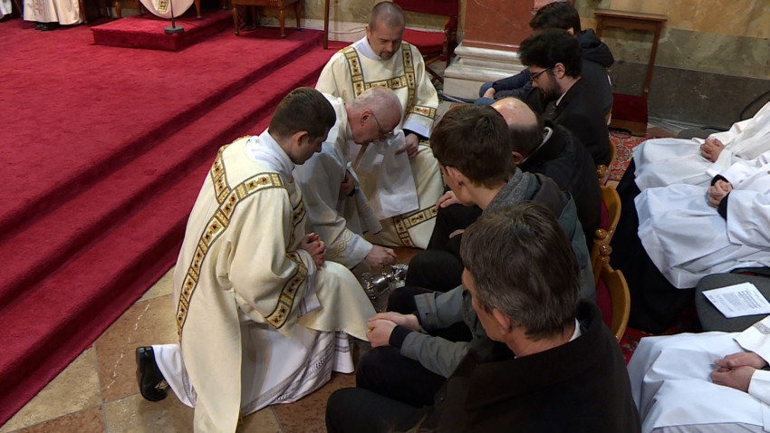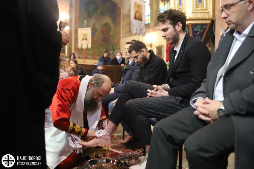 A koronavírus-járvány miatt az elmúlt két évben a lábmosás szertartása nélkül végezték a nagycsütörtöki Szent Liturgiát templomainkban. Idén az Attila téri főszékesegyházban Kocsis Fülöp metropolita, ahogyan azt egykor Jézus is tette, megmosta tizenkét férfi lábát.
