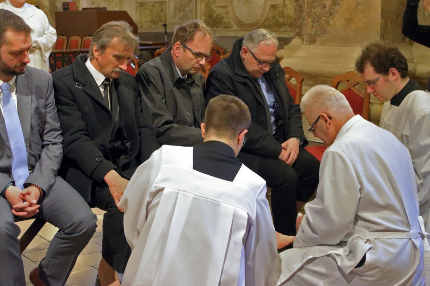 A homília felolvasása után a lábmosás szertartása következett; Reisner Ferenc általános püspöki helynök a győri székesegyház képviselőtestületi tagjainak lábát mosta meg.