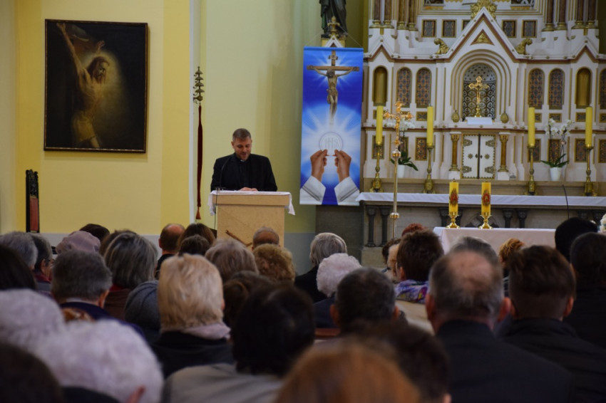 A nap főelőadója Hatházi Róbert, a kecskeméti Szent Család-plébánia plébánosa volt, aki előadásban kiemelte: az Eucharisztiában Isten a maga egyszerűségében vár bennünket, egészen közel jön hozzánk és találkozásra hív önmagával. Gyakran beszélünk nagypéntek Jézusáról, a haldokló Jézusról, de kevésbé látszik rajtunk az élő Krisztus, az a mély és személyes tapasztalat, hogy Ő az életünk része.