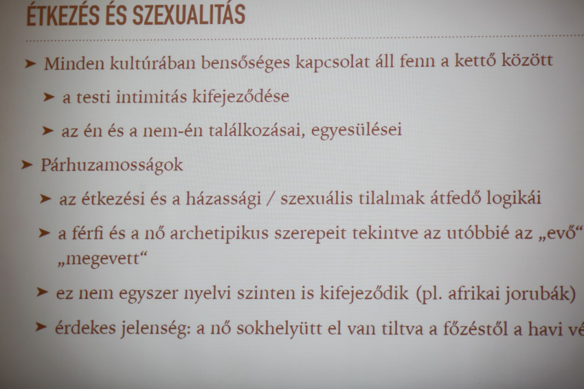 „Az étkezés paradox dolog, hiszen az embernek ennie kell, hogy éljen, viszont amikor eszik, akkor öl, növényt vagy állatot. Valami, ami élő volt, meghal azért, hogy egy másik élő tovább élhessen” – kezdte előadását. Az emberi kultúrákban az étkezés összefonódik a ritualitással, hiszen sajátos transzcendencia valósul meg benne: a nem én-t átalakítom, beleemelem az énbe.
