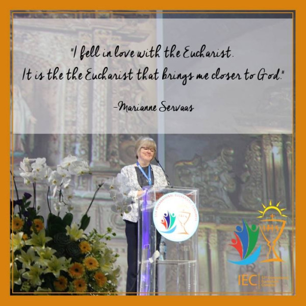 Robert Barron előadása után Marianne Servaas tanúságtétele következett, aki Belgiumból érkezett, ahol erősen szekularizált környezetben fáradozik a hit és az Oltáriszentség tisztelete élesztésén. Ő maga felnőttkorában tért meg, tudatos döntés révén. Sok keresztény közösséget ismert meg, de az is nyilvánvalóvá vált számára, hogy nem élhet egyfajta el nem kötelezett, felekezeten kívüli, „arctalan” kereszténységet. Két dolog volt, ami döntő hatást gyakorolt rá. Az első a Mindenszentek litániájának imádkozása volt – megkérdezte magától: tartozhatna-e ennél jobb családba? A másik az eucharisztikus jelenlét hite, amely a mai napig újra és újra tudatosítja benne, micsoda ajándék, hogy naponta szentáldozáshoz járulhat. Ebből remény fakad számára, különösen akkor, ha arra gondol: az egykor a legkatolikusabb nemzetek közé tartozó Belgium elhagyta hitét, múzeumnak tekinti a templomokat. Itt és most Krisztus jelenlétének reményadó erejére van szükség, hogy az ember ne vegyen fel negatív magatartást, beszédmódot, s a hitet se hagyja el. Örömteli és világos beszéd kell, melynek forrása az eucharisztikus közösség Istennel.