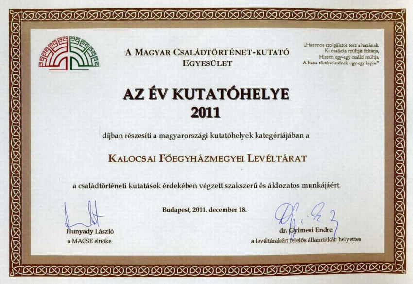 A díjat Gyimesi Endre, a levéltárakért felelős államtitkár-helyettes adta át a Magyar Országos Levéltár Lovagtermében. A díjátadáson a levéltárat két munkatársa, Lakatos Andor levéltárvezető és Tóth Krisztina képviselte. Az eseményt megtisztelte jelenlétével Bábel Balázs kalocsa-kecskeméti érsek, a fenntartó Kalocsai Főegyházmegye képviseletében. A levéltárosok, kutatók és a levéltárfenntartók képviselőit a Magyar Országos Levéltár képviseletében Reisz T. Csaba címzetes főigazgató, főosztályvezető köszöntötte. Hunyady László MACSE elnök és Németh József a kezdeményezés ötletgazdája méltatta a kalocsaiak úttörő munkáját, hangsúlyozva, milyen monumentális munkát vittek végbe az egyházmegye házassági anyakönyveinek digitalizálásával.
