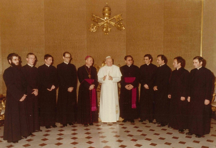– Egy régi fényképalbum jeles képe tárul elém, az Osservatore Romano 1979. november 27-én megjelent száma le is közölte: a Pápai Magyar Intézet nyolc ösztöndíjas papját külön kihallgatáson fogadta a pápa. II. János Pált egy évvel korábban választották meg – fiatalos volt, lendületes, olyan korú, mint most jómagam. Növendéktársaimmal ott álltunk a jobbján és balján a kis trónteremben: Erdő Péter, Ladocsi Gáspár, Ivancsó István, a másik oldalon Benyik György, Sávai János, Szaradics József és Dolhai Lajos. Igen megilletődött voltam, mindegyikünkön fekete reverenda volt, rajta fehér. Különféle római egyetemeken tanultunk, a pápa kedvesen bátorított minket. Később többször kísértem Lékai László bíborost a pápához, én voltam a római sofőrje. Amikor véget ért a megbeszélésük, én is megpillanthattam a pápát közelről, könyvtárszobája ajtajában. A vatikáni bazilika grottáiban lévő Magyarok Nagyasszonya-kápolna felszentelésekor az oltár mellett álltam, Hollai Antallal énekeltük a zsoltárokat, aki jelenleg albertfalvai plébános. A pápa első magyarországi útjakor Barsi Balázs ferences szerzetessel az esztergomi szentmise kommentárját vezettük, második látogatásakor pedig a MTV akkori munkatársait mutathattam be neki. Római élményeim között van megtámadásának estéje, 1981. május 13. is. Épp egy könyvesboltban voltam, amikor az egész város lármázta: lelőtték a pápát! Fél éjszaka ott ültünk a televízió előtt, vártuk a híreket a Gemelli kórházból, vajon túlélte-e. Igen sok pápai szertartáson lehettem jelen, amelyeket nagy összeszedettséggel, ugyanakkor közvetlenséggel végzett, ezek szintén elevenen élnek bennem.