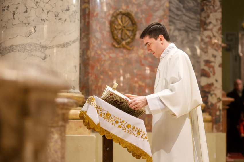 A lektor- és akolitusavatással egy állomáshoz értek most az áldozópapságra való készület útján – mondta a szónok. Felidézte: a mostani lelkigyakorlaton, amelyen Martos Levente Balázs püspök atyával együtt részt vettek, egy gondolat különösen megragadta: a lelkigyakorlat vezetője elmondta, mennyire fontosnak érezte, s milyen lelkesedéssel készült arra, hogy amikor pappá szentelik, kezébe veheti az Istent, a kenyeret, s elmondhatja az utolsó vacsorán elhangzott szavakat, és a kenyér az Élet Kenyere lesz, a mi megfeszített és halottaiból föltámadott Urunk dicsőséges jelenvalóságában, aki táplálni, erősíteni és egyre inkább át szeretne bennünket formálni. „A szentmisénk a vele való találkozás és együtt étkezés ünnepélyes lakomája, mely után arra küld bennünket, hogy őáltala átformáljuk magunkat, s ezáltal a világot.” Mindazokat, akik naponta találkoznak Krisztussal, az ő életére hívja. Arra az életre, amely a Szentlélek által bele akar simulni a Mennyei Atya akaratába, a szentháromságos Egyisten életébe, amely az ingyenes és önzetlen szeretetközösség boldogsága.