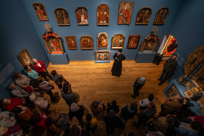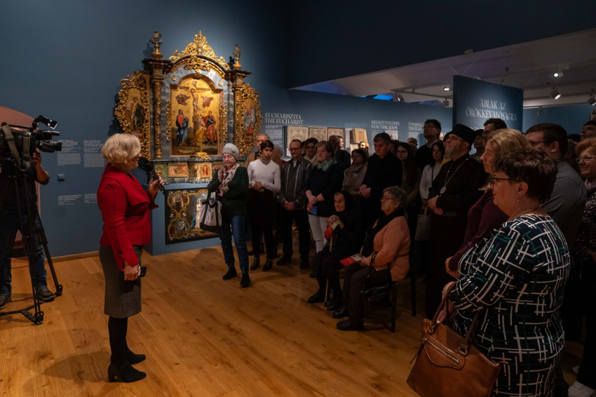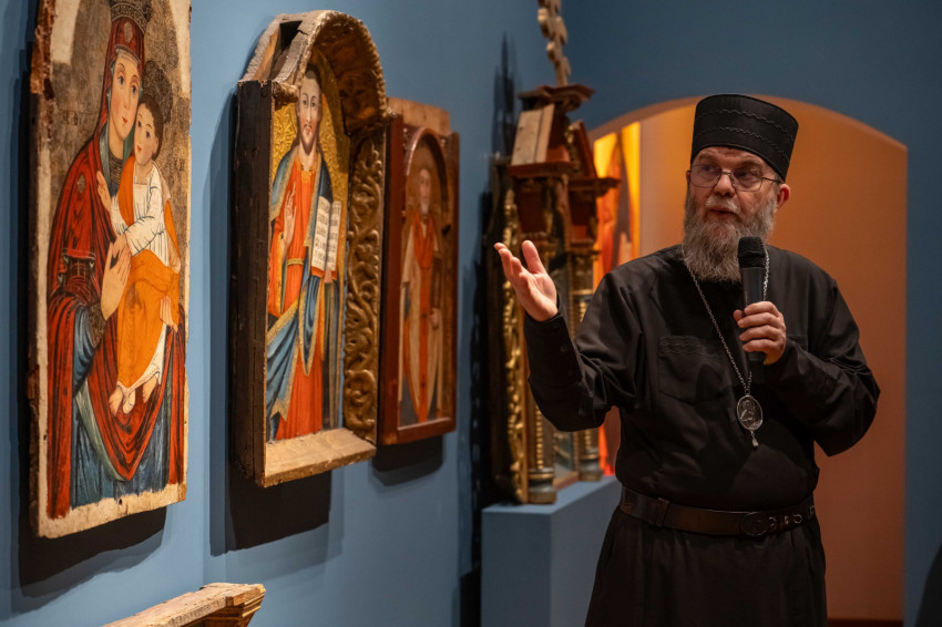 Az ikonok megszólítanak című tárlatvezetésén Orosz Atanáz püspök többek között arról beszélt az Ablak az örökkévalóságra című állandó tárlat kiállítóterében, hogy életében milyen szerepet töltenek be az ikonok, hogyan szólítják meg őt.