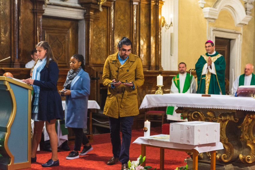 A szentmise bensőséges, felemelő mozzanata volt a felajánlás, amelyet az egyetemes könyörgésekkel kötöttek össze. Az elsőévesek térképet hoztak és a helyes irány megtalálásáért imádkoztak; a zenecsoport zeneeszközöket, pengetőt hozott, arra kérve Istent, hogy a jó hangokat szólaltassák meg. A román egyetemisták az otthoni csomag jelképét hozták és ekkor a szülőkért szólt az ima. A Mécses közösség tagjai is jelen voltak, ők gyertyát hoztak, hogy mindig fényt áraszthassanak. A Kolozsváron tanuló külföldi diákok franciául könyörögtek, s mivel többnyire orvosnak tanulnak, sztetoszkópot hoztak. A hívek adományait, valamint a bort és kenyeret a ministránsok hozták az oltárhoz.