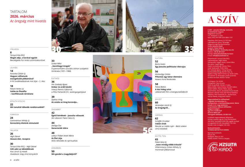 A Szív jezsuita magazin márciusi cikkei körüljárják az aktív idősödés és a spiritualitás összefüggéseit, gyakorlati példákat mutatnak az egészséges időskorra való felkészüléshez, és személyes történeteken keresztül vizsgálják a generációk kapcsolatát. „Miért akarnék harmincéves nőket vagy huszonéves naivákat játszani hatvanévesen? Borzalmas lenne, Isten őrizz! Nem, köszönöm. A színészek akkor jók, ha magukat adják, a korukkal együtt. Van egy közmondás, miszerint ötvenéves korára mindenkinek olyan arca lesz, amilyet megérdemel. Annál nagyobb erő nincs, mint hogy az ember úgy vállalja magát, amilyen. De eddig el kell jutni” – mondja a címlapinterjúban Für Anikó színművésznő, akit kérdeztek pályafutásáról és a gondviselésről is.