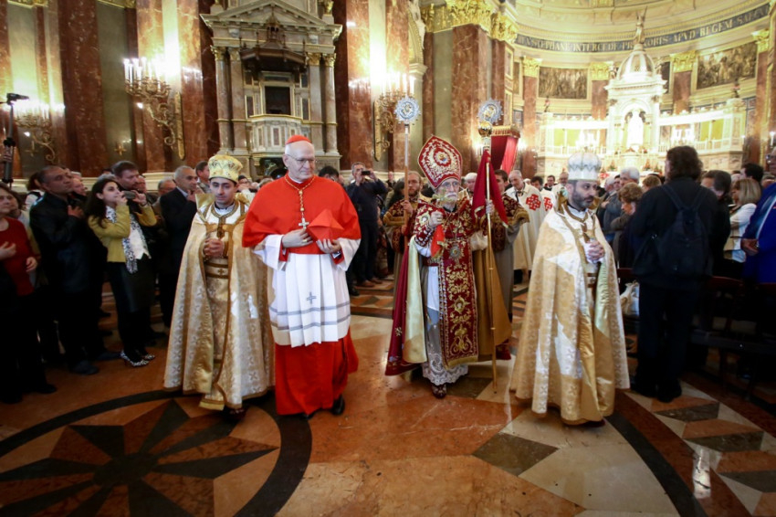 A pátriárkai szentmise kezdete előtt Erdő Péter köszöntötte Nerszész Bedroszt és a jelenlévőket magyar és olasz nyelven: