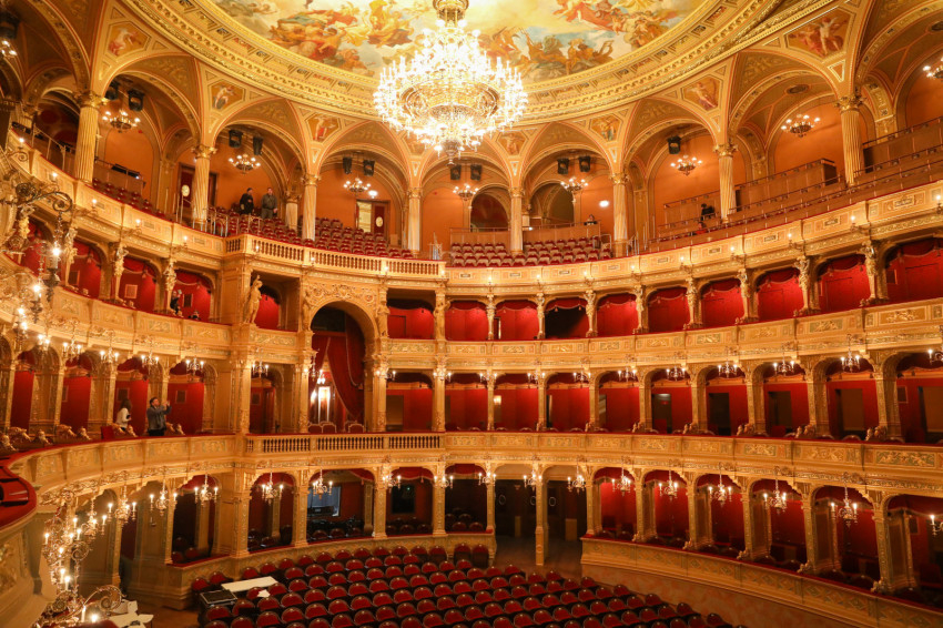 A jól ismert és szeretett színházterem vonzása, pozitív kisugárzása leírhatatlan. Aranyköd; az olvadt arany, a csorgatott méz, a tokaji aszú színeiben persze nem fáznak az olimposzi istenek. A gigantikus bronzcsillár fürtös sugárkoszorú, a Lotz-freskó gomolygó glóriakorong az átrendezett nézőtér felett. Az emelhető-süllyeszthető zenekari árkot bővítették; szintén a reneszánszot idézi elegáns bábos korlátja. A színpadnyílást festett függöny keretezi. Az óarany hátterű, egyiptomi kékkel „kirajzolt” vasfüggöny dús, de nehezen kivehető allegorikus képét az egyik Ybl-terven szereplő Lotz-skicc alapján készítették el.