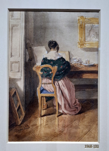 Milyen is volt az otthon a 19. század első évtizedeiben, illetve a közepe táján? Jakob Alt enteriőrjei a Habsburg Birodalom leggazdagabb családjainak otthonaiba enged bepillantást. A művész az embert is megjeleníti a klasszicizáló biedermeier szalonban, ahol a túldíszített tapétával borított falakon képek sorakoznak. Egy szépen felöltözött fiatal hölgy éppen levelet olvas az íróasztalánál ülve. A méretes ablakon túl, odakint fák hajladoznak – egy kastély emeleti szobájában vagyunk.