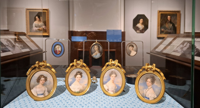Az egyik tárlóból négy „apró” hölgy néz ránk lelkesen: négy miniatúra. Kézzel festett, kis méretű medalionok ezek, csoda szép, aranyos keretben. A kis portrék báró Kray Ferenc lányairól készültek.