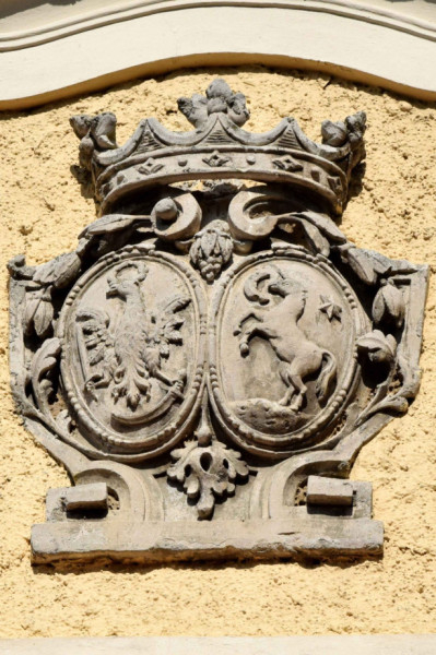 A mai barokk templomot építő házaspár koronás kettős címere a homlokzaton: balra a Szegedy-, jobbra a Rosty-családé (Fotó: Simon Anna)
