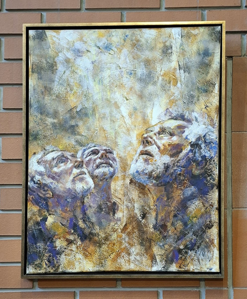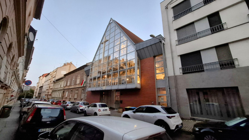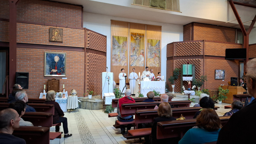 Még sohasem jártam az épületben, azt gondoltam, irodaház lehet, közelebb érve azonban rájöttem, hogy ez bizony egy templom. Még tartott a mise, amikor beléptem az ajtón, Gájer László atya, tanszékvezető egyetemi tanár éppen a befejező résznél tartott. Ezt mondta: „Kérjük, áldd meg ezeket a képeket, mindegyiket itt a templomban, amelyeket a te tiszteletedre készítettek és szeretettel festettek. A te bőkezűségedből nyert ajándékok ezek. Töltsd el a szívünket szent Lelked örömével, miközben nézzük ezeket a képeket. Krisztus, a mi Urunk által.”