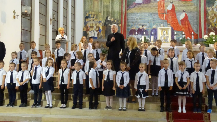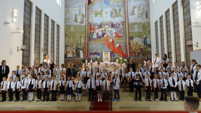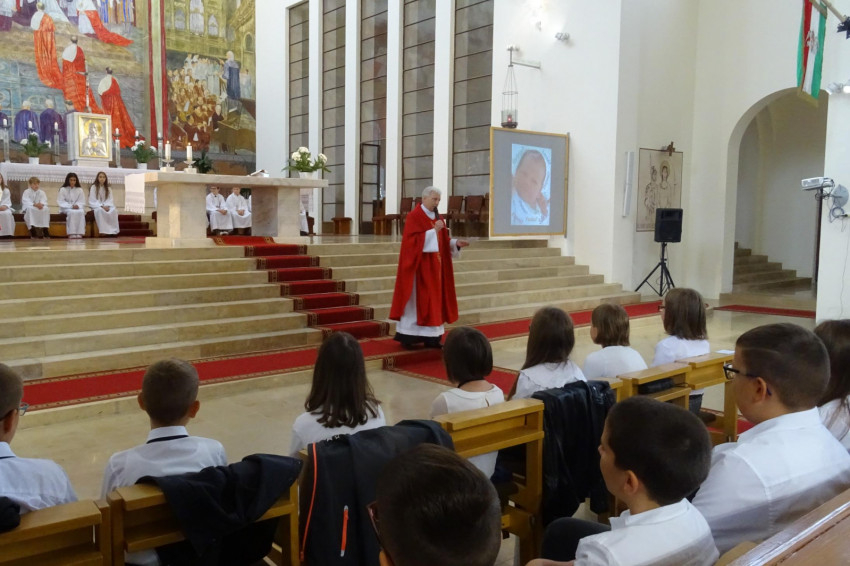 A hívek könyörgésében, melyet a 4. osztályos tanulók olvastak, közösen imádkoztunk, hogy az előttünk álló feladatokat a legjobb tudásunk szerint Isten áldásával végezhessük. Nagyon sokan elvégezték szentgyónásukat, ezért az Oltáriszentséggel megerősödve vághatunk neki az előttünk álló feladatoknak.
