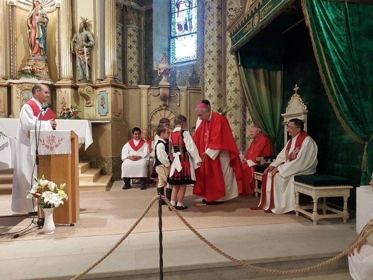A liturgia végén székely népviseletbe öltözött gyerekek köszöntötték a jeles vendéget, és ajándékot adtak át neki.