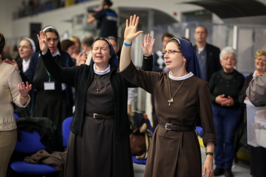 Az előadás után mindenki feláll, és a kezek is felemelkednek. Imapárosok állnak össze, és egykettőre hosszú sorok alakulnak ki az imájukat kérőkből. A színpadról pedig a Szentlélek friss kiáradását kérik. Húsz perc múlva aztán előrehívják azokat, akik még nem kerültek sorra, és értük imádkoznak. Mint VI. Pál mondta, sok katolikus karizmái alszanak. Mi fel akarjuk őket ébreszteni, hangzik el. Aztán a karizmatikus megújulás ötvenéves római jubileumáról esik szó, amelyen Ferenc pápa is beszélt, és az derült ki a szavaiból, hogy jól ismeri, sőt belülről ismeri a mozgalmat.
