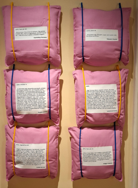 A falon rózsaszín párnákon kis fehér lapokra gépelt naplórészletek olvashatók – az írók álmainak feljegyzései. Szellemes megoldás. Érdemes idézni az egyiket, mert olykor mi is álmodunk hasonló őrültségeket: „Egy furcsa álom: cseléd voltam, és haza akartam jönni Körtvélyesre, siettem a vonat elé. A vonat elgázolt, de nem tudtam, hogy meghaltam, felkeltem és mentem tovább. Egyszerre meglátta egy nő, hogy kísértet vagyok, megijedt, és rémültem sikoltott. Az ő félelmén tudtam meg, hogy kísértet lettem, éreztem, hogy nyúlik és torzul, rémes magasba eltorzult a vasút által lelapított testem. Ijedten futottam és berohantam egy kis svábhegyi sétatérfélére. (…) Ez a sétatér temető volt álmomban, egy asszonyhoz rohantam, aki az úton imádkozott, de az elrohant tőlem. Rémes volt az a közborzadály” – Lesznai Anna (1920).