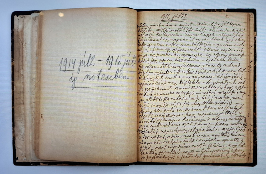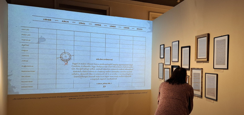 A kiállítás egyik termében a falra kivetítve egy hatalmas naptár látható, melyben változó dátumokkal különféle naplórészletek olvashatók más-más szerzőtől. Érdemes elolvasni például Bölöni Györgyné bejegyzését: „Reggel öt órakor érkezett haza a szerkesztőségből szegény agyonnyúzott idegű Gyurkám, és elmesélte, hogy Budapest népe őrült lelkesedéssel a háború mellett van. Ma éjjel zuhogó esőben, szakadó záporban százezrek tomboló lelkesedéssel tüntettek a kitört háború és a hadsereg mellett. Katonákat, tiszteket emeltek vállukra, éljenezték őket, és nótázva járták be az utcákat. A szerkesztőségben a lentről felhangzó Kossuth-nóta és az Eugen-mars zenéje mellett dolgoztak a megriadt, izgatott munkatársak.” (1914. július 26.)