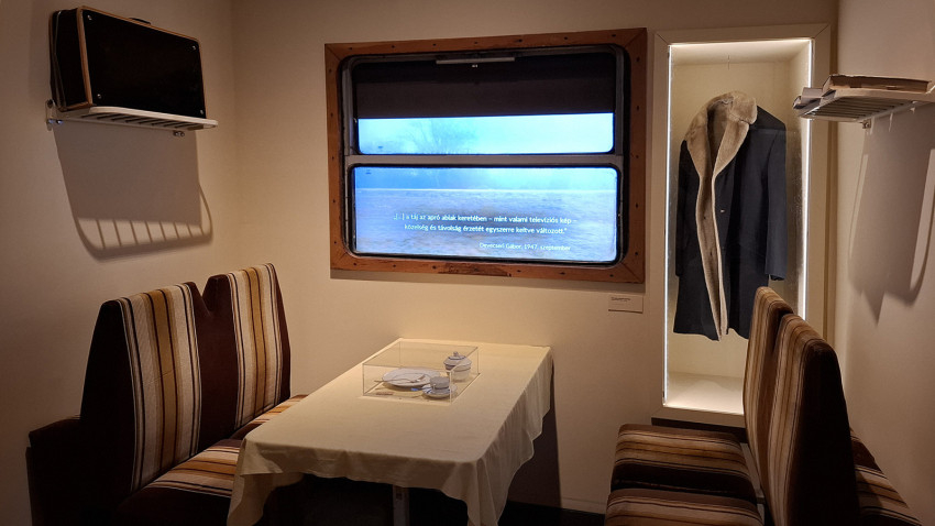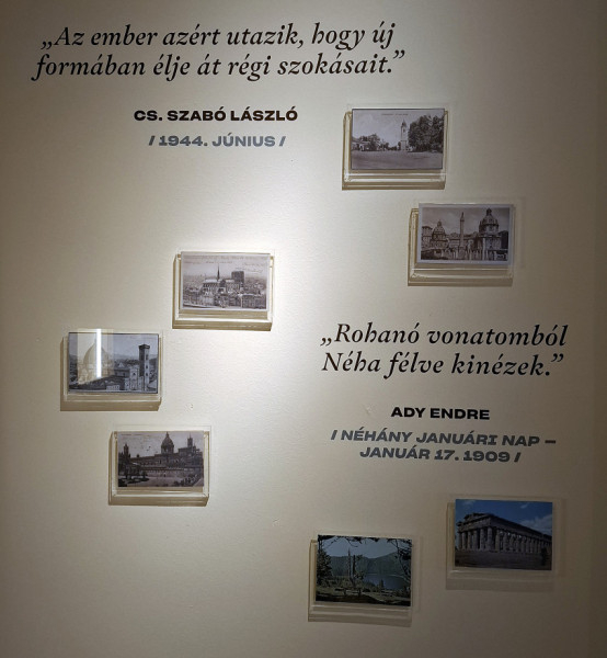 A kiállítás érdekes fejezetét alkotják az útinaplók. Ehhez a témakörhöz remek hangulatot teremtettek a kurátorok: egy elképzelt vasúti kocsi berendezett fülkéjét láthatjuk, valódi ablakkal, amelyen keresztülnézve csak úgy szalad a szemünk előtt a színes táj, persze videón. Az étkezőkocsiban vagyunk, hiszen az asztalon abrosz, rajta tányér, poharak, a csomagtartón könyvek sorakoznak. Az ablakban megjelenik egy Devecseri Gábor-idézet: „(…) a táj az apró ablak keretében – mint valami televíziós kép – közelség és távolság érzetét egyszerre keltve változott” (1947. szeptember). A fülke jobb oldalán Németh László átmeneti kabátja lóg a vállfán.