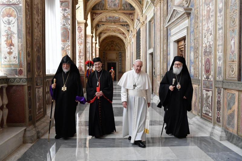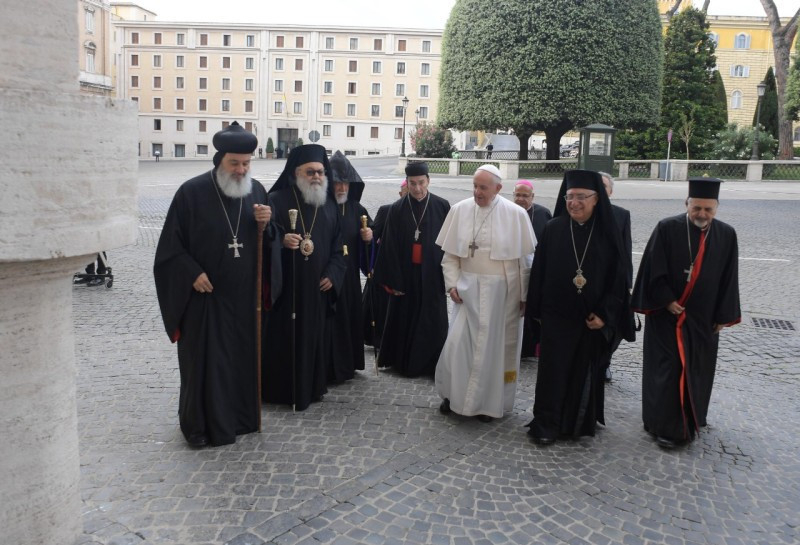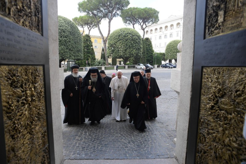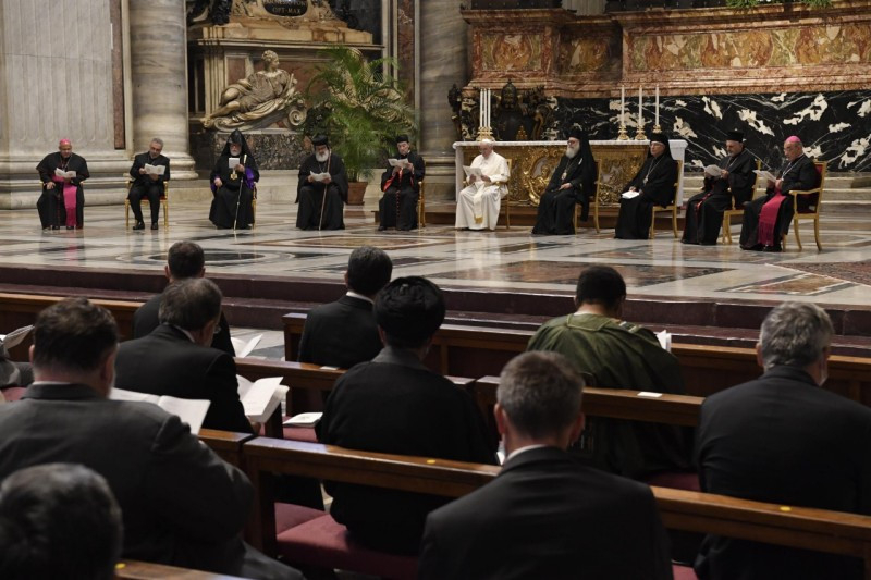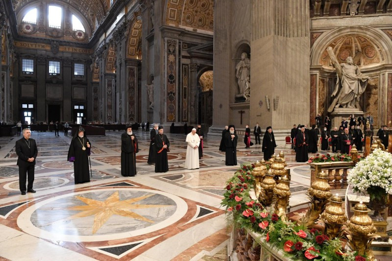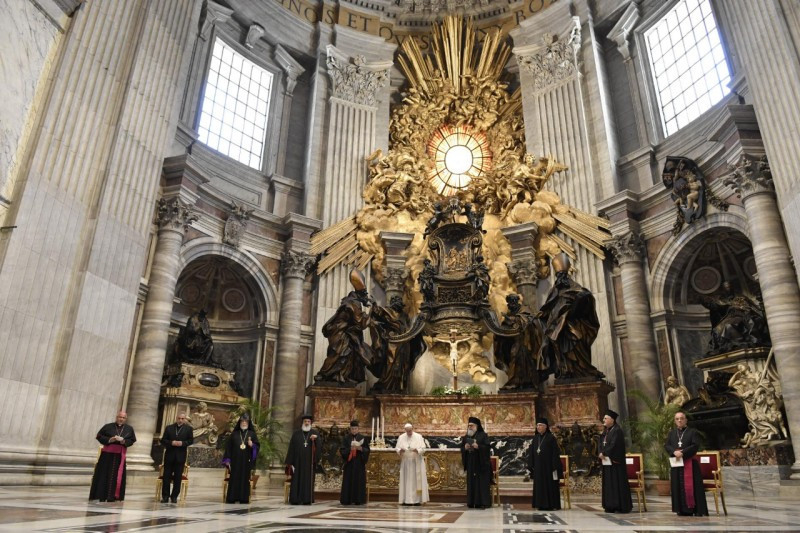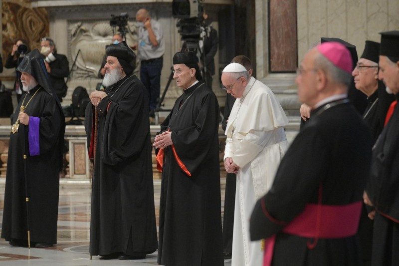A Szentatya a Szent Márta-háznál köszöntötte a vendégeket, majd átmentek a Szent Péter-bazilikába, ahol a Péter sírja fölött álló oltár előtt elimádkozták a pápa vezetésével a Miatyánkot, amelyet a libanoni keresztény egyházak vezetői arabul mondtak el.