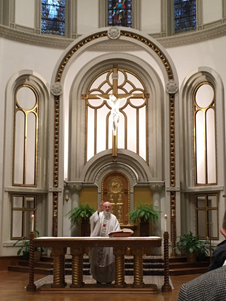 az ünnepi misét celebráló Iván atya és Laci atya ugyanis kéthetente felváltva járnak be saját templomukból New Yorkba misét tartani.
