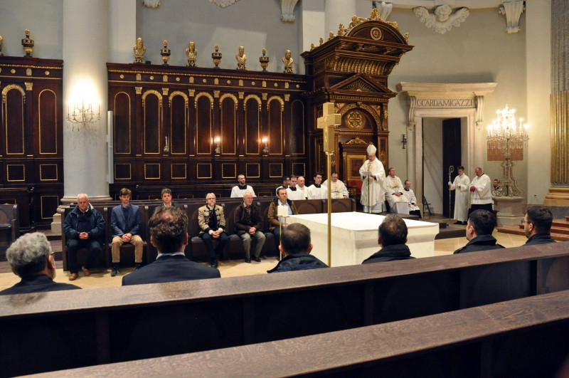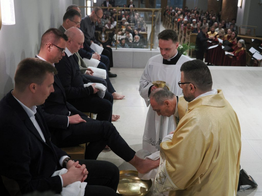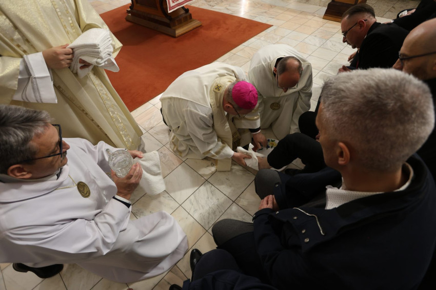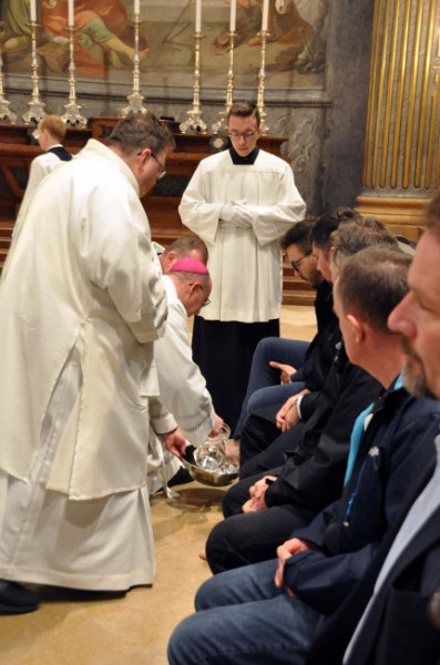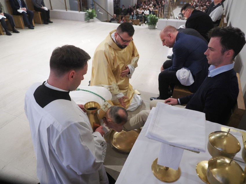 Majd kezdetét vette a lábmosás szertartása. Az evangélium szavaira a püspök úgy cselekszik, ahogyan azt a Mester tette, aki maga is megmosta tanítványai lábát, hogy alázatra tanítsa ezzel apostolait.