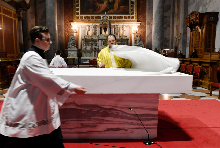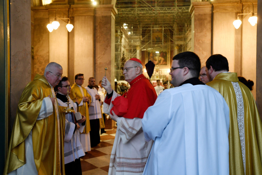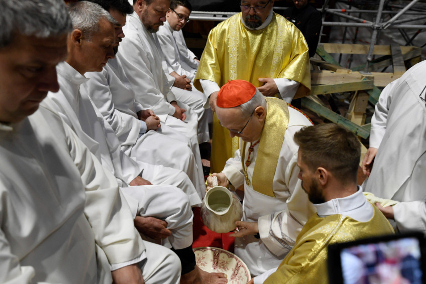 Nagycsütörtök este, az utolsó vacsora emlékére Erdő Péter bíboros, prímás mutatott be szentmisét a felújítás alatt álló esztergomi Nagyboldogasszony- és Szent Adalbert-főszékesegyházban.