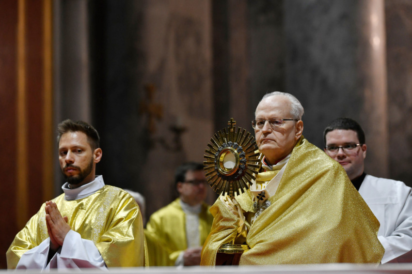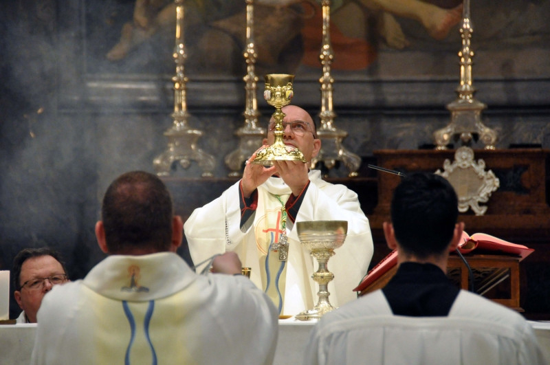 „Az Egyház az Eucharisztiából él” – Szent II. János Pál pápának az Eucharisztia és az Egyház kapcsolatáról szóló enciklikájának első szavait idézve a főpásztor rámutatott, a húsvét titkának ismerete nélkül nem érthetjük meg az Eucharisztia titkát sem. Felvetődhet a kérdés, hogy egyáltalán fel tudjuk-e fogni ezt a titkot, hogy Isten a kenyér és a bor színe alatt megjelenik közöttünk, és köztünk, velünk lakozik.