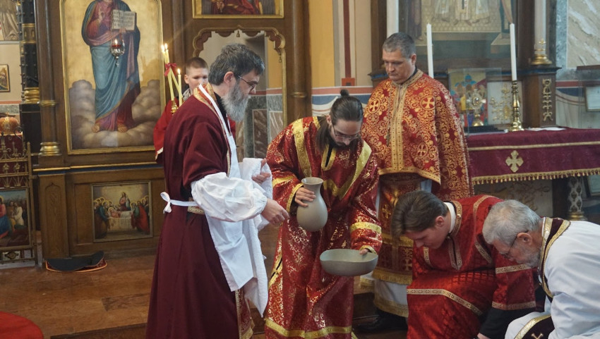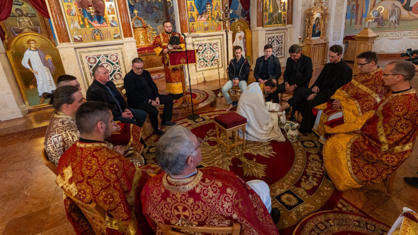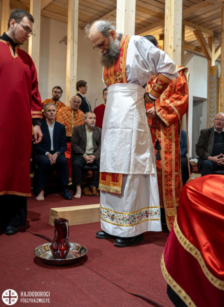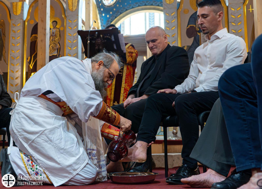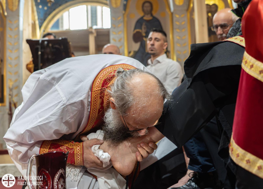 Az ünnepi liturgia végén Kocsis Fülöp metropolita elvégezte a lábmosás szertartását is. Miközben Nyirán János fődiakónus az evangélium erről szóló részét olvasta, a főpásztor Krisztushoz hasonlóan levette felsőruháját, kendőt kötött magára, s kancsóval a kezében megmosta tizenkét férfi, egy parókus, egy papnövendék és a környező városi parókiák kiválasztott híveinek lábát. Az utolsó vacsorán Jézus végtelen szeretetét mutatta ki a lábmosással tanítványai felé, ugyanakkor példát is állított eléjük abban, milyen magatartással viseltessenek egymás iránt. Ezért is tekintünk rá a szolgálatkészség és a legteljesebb odaadás mintájaként.