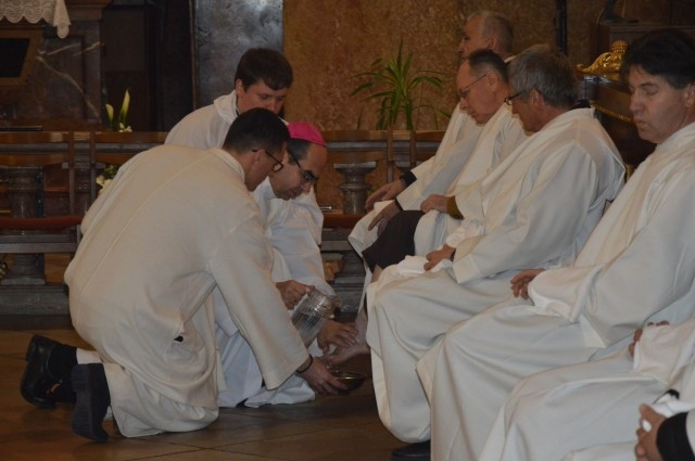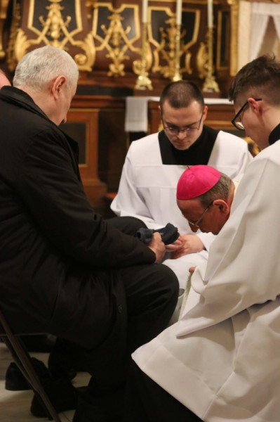 Ezután Krisztus cselekedeteit utánozva levetette felső ruháját, derekára kendőt terített, kezébe kancsót vett és sorra letérdelt papjai elé, megmosta és megcsókolta lábukat. A megjelenített bibliai szakaszokat Mosolygó Béla kancellár olvasta fel, közben a papnövendékek adtak halk kíséretet az Evangélium főszólamának.