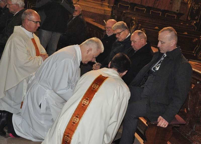 A homília után a lábmosás szertartásához a főpásztor leváltotta miseruháját, egyszerű vászonkendőt kötött maga elé, és az oltár előtt megmosta a város képviselőtestületeiből érkezett tizenkét férfi lábát. Ezt követte a hívek könyörgése.