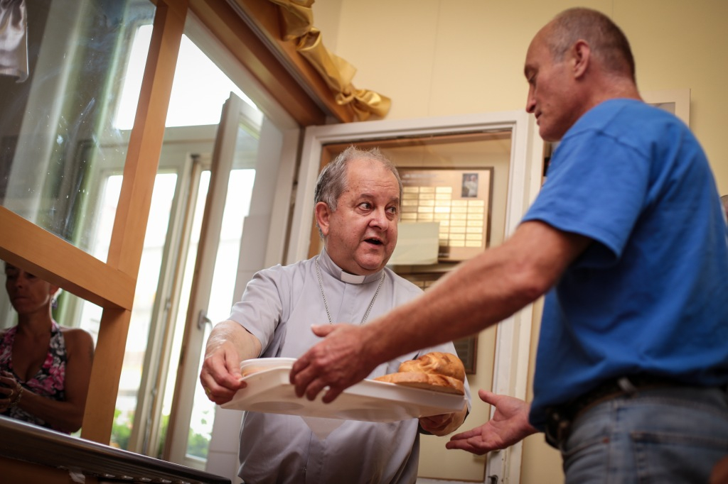 Az irgalmasság kötelességünk, de ha csak lehet, tegyünk kötelességünkön felül is. A Wojtyla-ház csupán csepp a tengerben, de hiányozna, ha nem lenne, teszi hozzá. Aztán – két adományozó, a Precíz Kft. és a Zöldért jóvoltából – az ebéd következik, amelyet az érsek oszt ki, és a ház mintegy ötven vendégének körében fogyaszt el.
