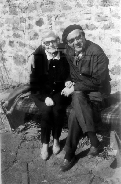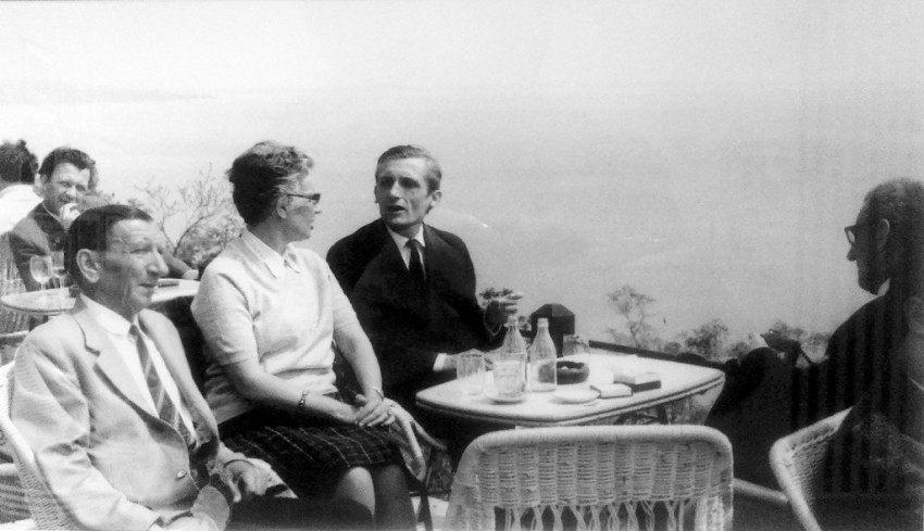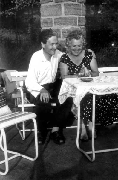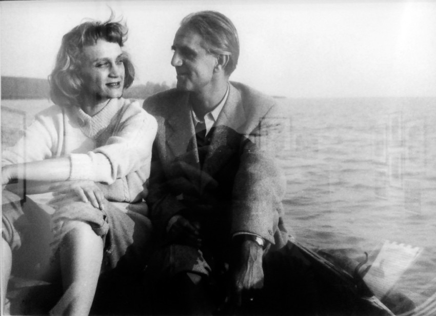 A balatoni nyaralóépítések hőskora az 1950-es ’60-as évek időszaka volt. Akadtak persze olyanok is, akik már az 1930-as években építettek maguknak nyaralót a Balatonnál, de ez csak a későbbi évtizedekben vált általánossá. Ezekben az években egyre több író vásárolt magának telket vagy házat a magyar tenger partján. A legismertebbek közé tartozik Illyés Gyuláék tihanyi, alsó-kopaszhegyi háza, amelyet fokozatosan a maguk képére formáltak. Azelőtt az író apósáé volt. Déry Tiborék Lipták Gábor segítségével bukkantak rá a felújításra váró füredi villára és kertre, míg Németh Lászlóék sajkodi házát a család építette fel. Passuth Lászlóék is Tihanyban vettek telket, erre építkeztek. Bertha Bulcsu Balatongyörökön, Veres Péter és Kodolányi János Balatonakarattyán, Rónay György Balatonszárszón, Takács Gyula Becehegyen találta meg a pihenést és a csöndet a természet, a tó közelségében. A balatoni nyaralók természetszerűleg a családi élet színterei voltak, de – ahogyan Tüskés Tibor fogalmaz – lehetett találni itt „alkalmat a munkára, témát az írásra”. Megkapó jelenet, ahogyan Németh László és felesége, Démusz Ella sajkodi nyaralójuk teraszán ülnek és jókedvűen csevegnek. A kép 1960 körül készült, Koczogh Ákos felvétele.