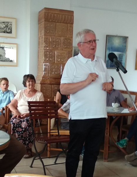 Ahogy Magyarország nem képzelhető el a Balaton nélkül, úgy a Balaton sem képzelhető el Tihany nélkül, mondta házigazdaként Korzenszky Richárd emeritus perjel, majd felidézte egy réges-régi élményét. Mikor egyszer a Csendes-óceán partjáról érkezve a Nosztori-völgyből megpillantotta a Balatont, kifakadt belőle: a világ legszebb óceánjáért se cserélném el ezt a „koszos tavat”. Megvallotta, hogy ma már ő is igazi otthonának érzi a települést, utazásaiból visszatérve nem pusztán Tihanyba, hanem haza érkezik. Tamási Áron regényhősének, Ábelnek halhatatlan szavait idézte: „Azért vagyunk a világon, hogy valahol otthon legyünk benne.” Méltatta Csizmazia András lokálpatrióta érzelmeit is: a gyűjteményéből származó képek mind a honszeretetről, az otthon-élményről vallanak.