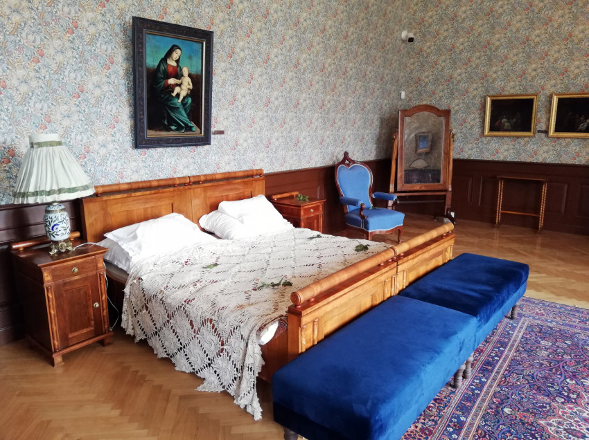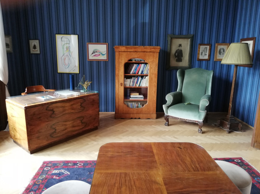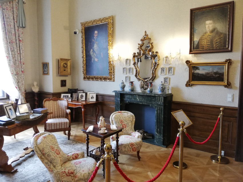 A kastély eredeti bútorai közül mindössze öt maradt meg, a többi elveszett vagy elpusztult az idők során. A könyvtár melletti kisebb helyiség a gróf írószobája volt, ahol munka közben minden az ifjan elveszett szeretteire emlékeztette. Nádasdy Ferenc itt intézte az uradalmi ügyeket és a levelezését, itt folytak a megbeszélések. És ez volt az emlékezés helye is: a falon a képek a közvetlen családtagjait ábrázolták. Itt sorakoznak Zichy Ilona képei: az egyiken még menyasszonyként látjuk, a másikon már a kislányával. Az íróasztalról, egy képről szintén gyermekei és felesége tekintettek a grófra. Az ifjan elhunyt testvér, Tamás portréját Orlay Petrics Soma festette meg.