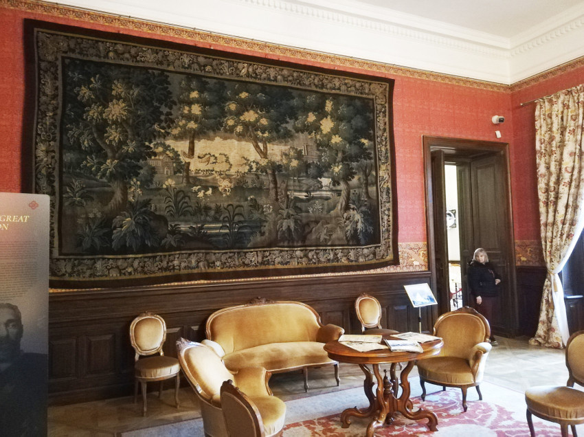 Most menjünk át a társasági élet színterére, a szalonba. A magas belmagasságú, tágas terembe lépve rögtön feltűnik a szemközti falon egy hatalmas gobelin. Érdekessége, hogy készítője csak a zöld szín árnyalatait használta, a címe: Szárnyasok a természetben. Verdürnek is nevezik a falikárpitnak ezt a típusát, amelynek első darabjai a 15. században készültek, és valamennyi fás-ligetes természeti képet ábrázol. A kifejezés a francia vert (zöld) szóból származik, utalva arra, hogy a természetet többnyire a zöld különböző árnyalataival jelenítették meg. Források alapján tudjuk, hogy a kortársak a Nádasdy-gyűjtemény legértékesebb darabjának egy Hollandiából származó selyemgobelint tartottak, amelynek koráról és témájáról nem maradt fenn információ. Ezt a szalonban most látható, nagy méretű, 18. századi falikárpitot a kastély korábbi felújításakor vásárolták meg és restaurálták.